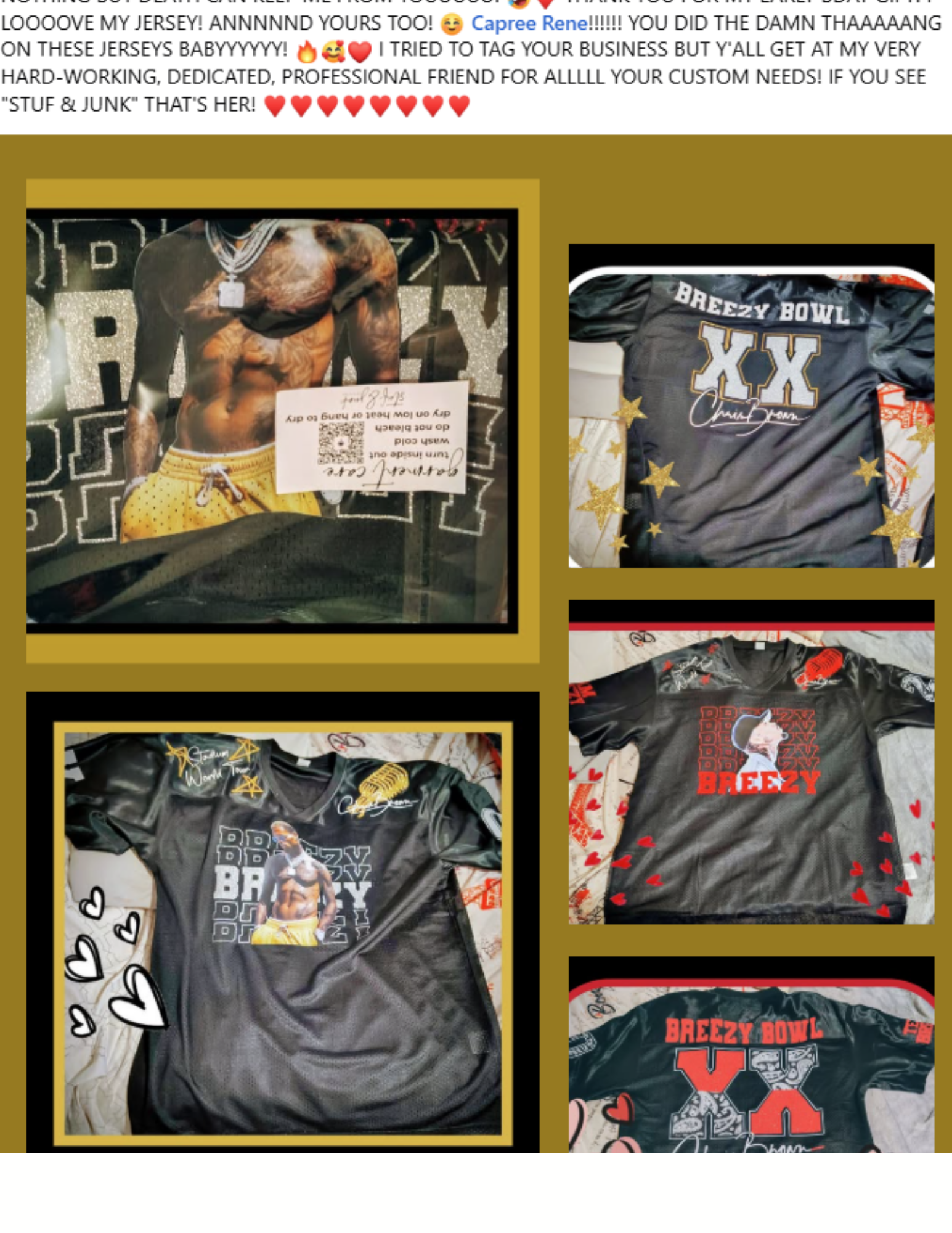 "I LOOOOVE MY JERSEY! ANNNNND YOURS TOO! Capree Rene!!!!!! YOU DID THE DAMN THAAAAANG ON THESE JERSEYS BABYYYYYY! I TRIED TO TAG YOUR BUSINESS BUT Y'ALL GET AT MY VERY HARD-WORKING, DEDICATED, PROFESSIONAL FRIEND FOR ALLLLL YOUR CUSTOM NEEDS! IF YOU SEE "STUF & JUNK" THAT'S HER!"