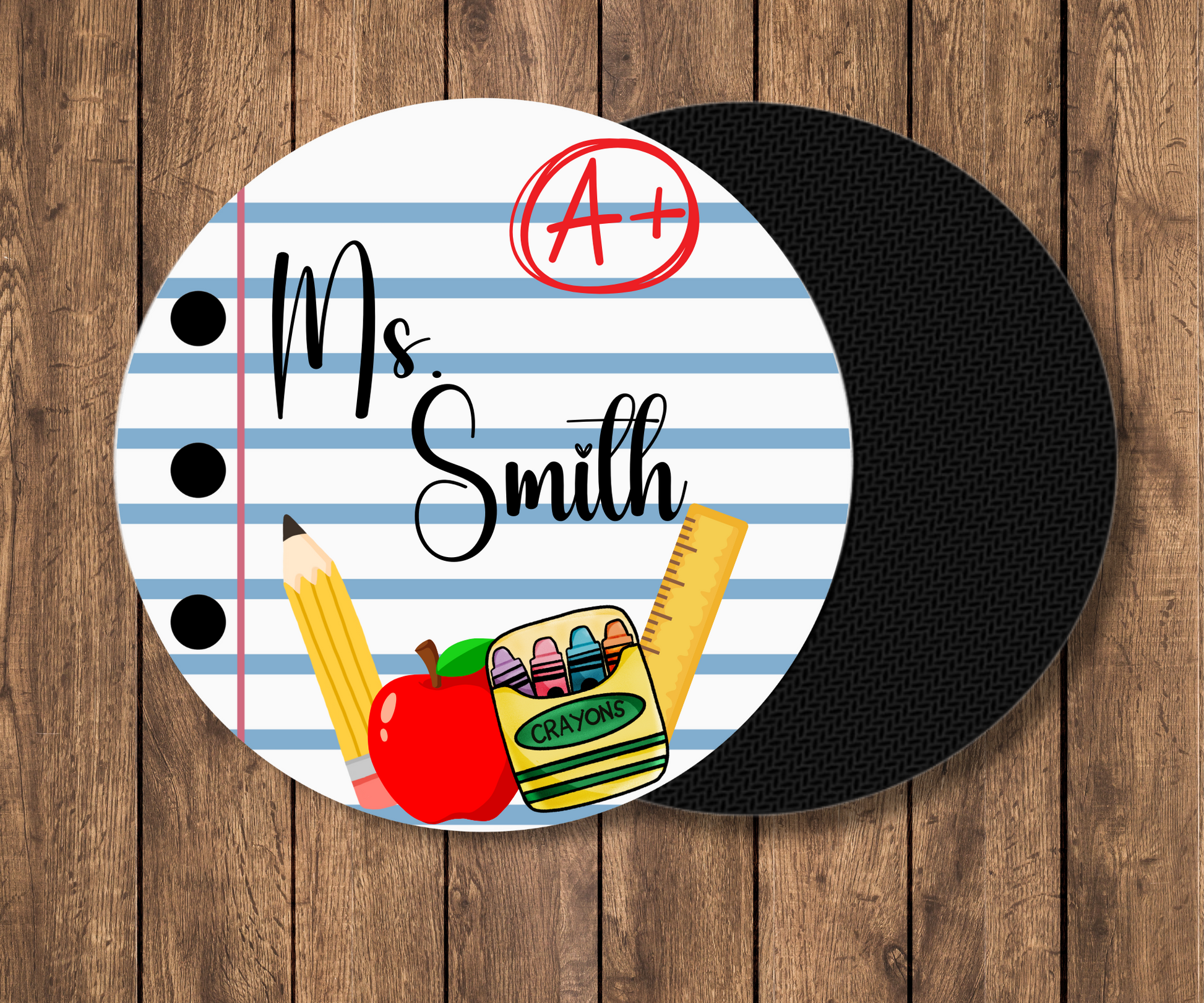 Cutify your workspace with our A+ Mouse Pad, designed to bring both style and functionality to your desk. This round 7.87 x 7.87-inch mouse pad features a charming notebook paper design adorned with cute teacher-themed images like crayons, rulers, and more. At the top of the pad, an A+ adds a touch of encouragement and motivation. Personalize this delightful mouse pad with your name or the name of your favorite teacher, making it a thoughtful and practical gift.