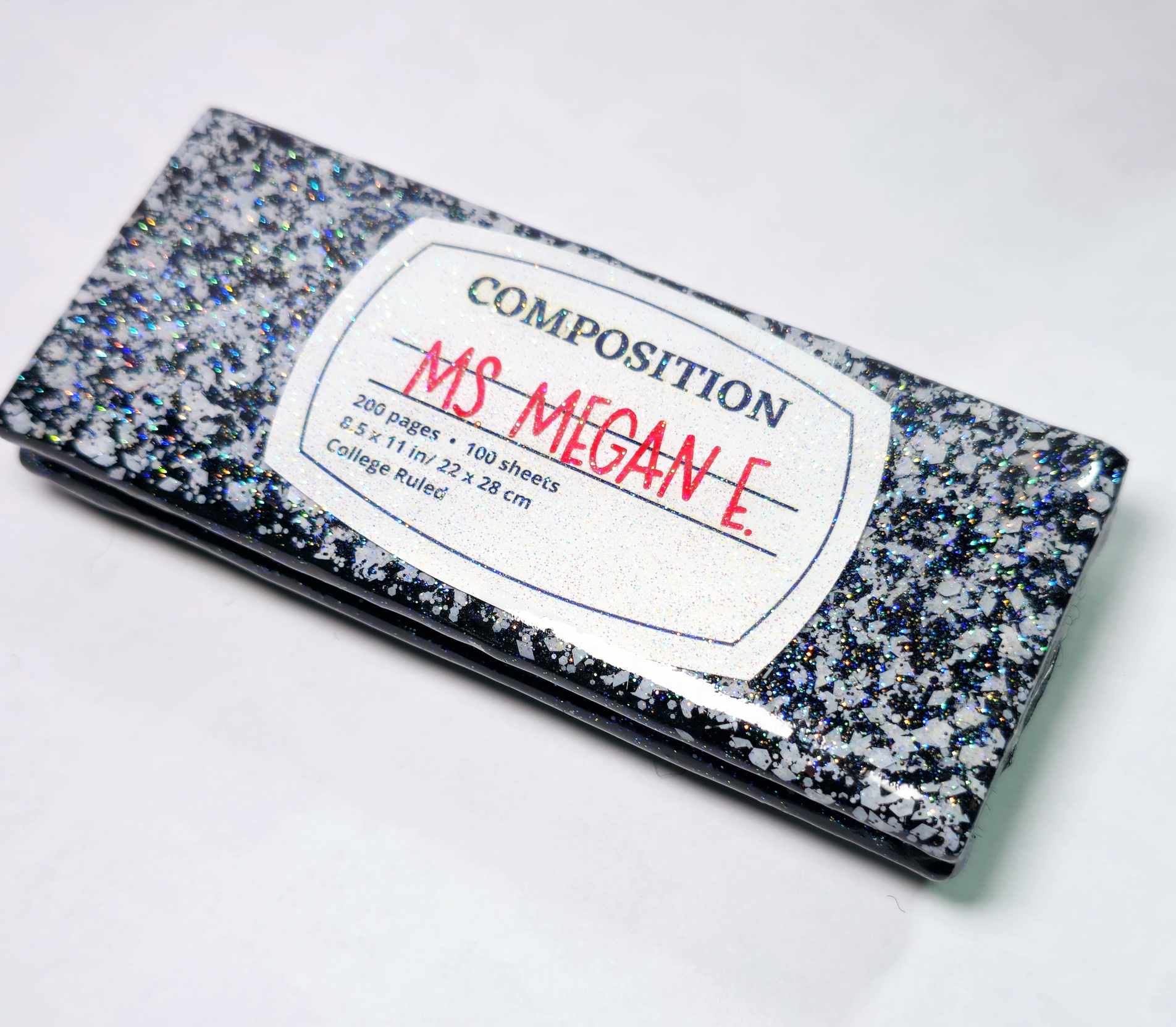 Enhance your classroom or home office with our Handmade Composition Notebook Dry Eraser, a perfect blend of style and functionality. This dry eraser is meticulously crafted with high-quality glitter, holographic sparkle, vinyl, and paint, ensuring a unique and eye-catching design. Its composition notebook style adds a touch of charm, making it a delightful addition to any workspace.