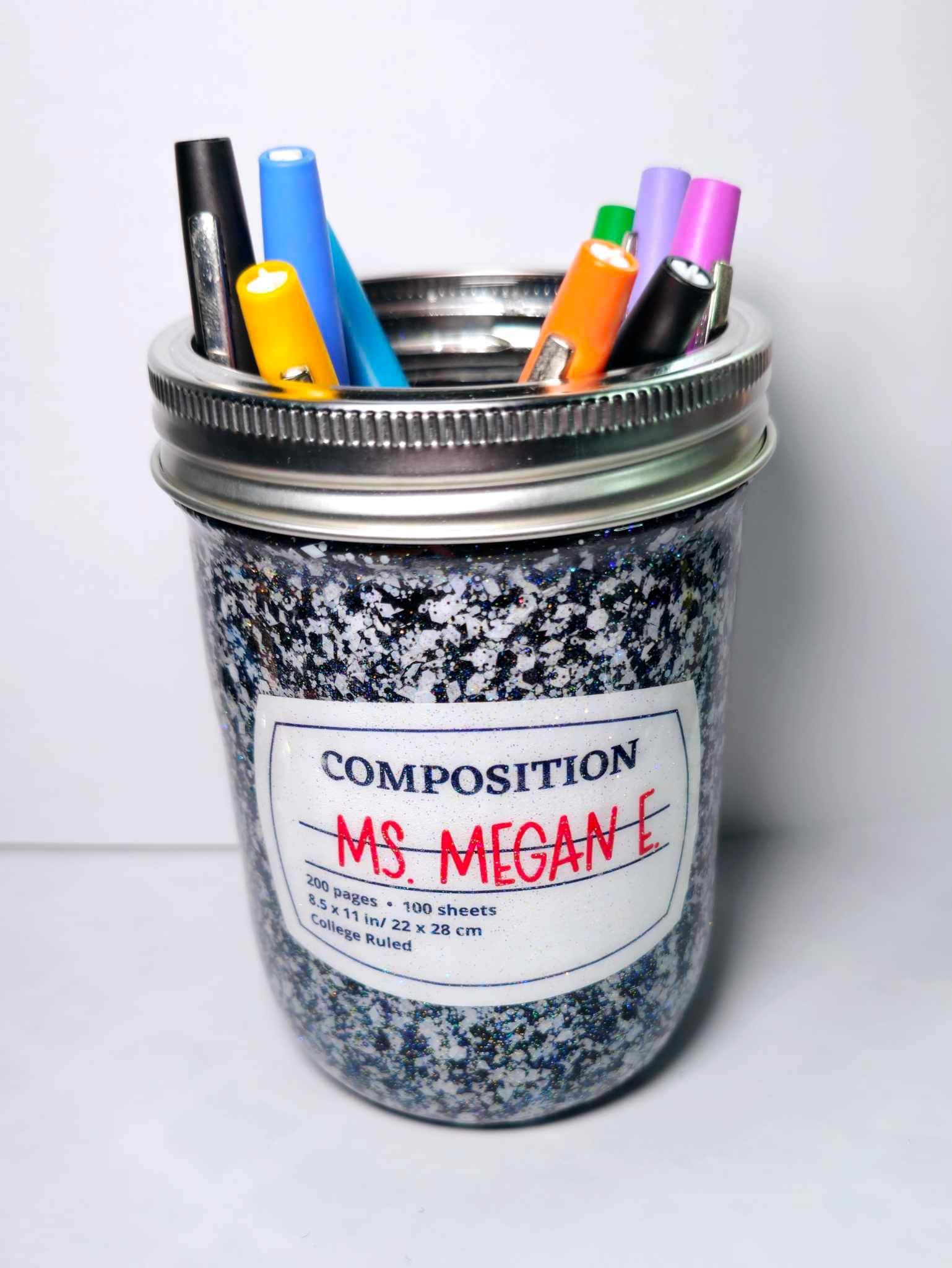 Transform your workspace with our Handmade Personalized Composition Notebook Pen and Pencil Holder, perfect for teachers and parents alike! This 16 oz mason jar, crafted with high-quality glitter and a touch of holographic sparkle, adds a delightful razzle-dazzle to any desk. Each jar is meticulously handmade to order, ensuring a unique and personalized touch for every customer. Whether you're organizing pens, pencils, scissors, or other essentials, this jar is a stylish and practical addition to your collection.